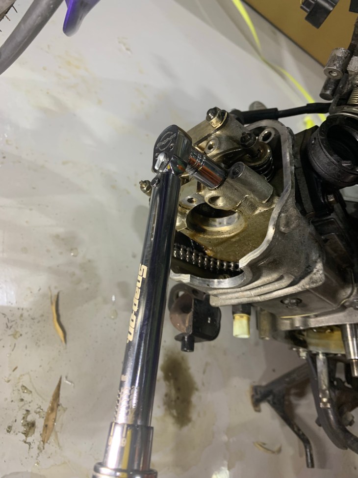カムシャフトのスプロケを取り付けてチェーンをかけ、クランクを2回転させて合いマークを確認!
