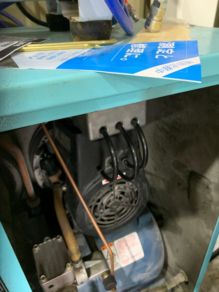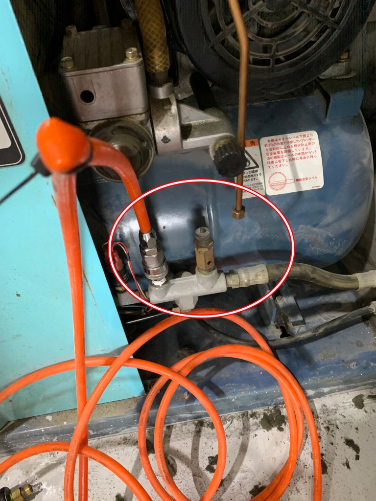 こんにちは!わだちの伊丹です!工場の電気を朝入れたときに何やらコンプレッサーのほうから変な音が…見に行くと