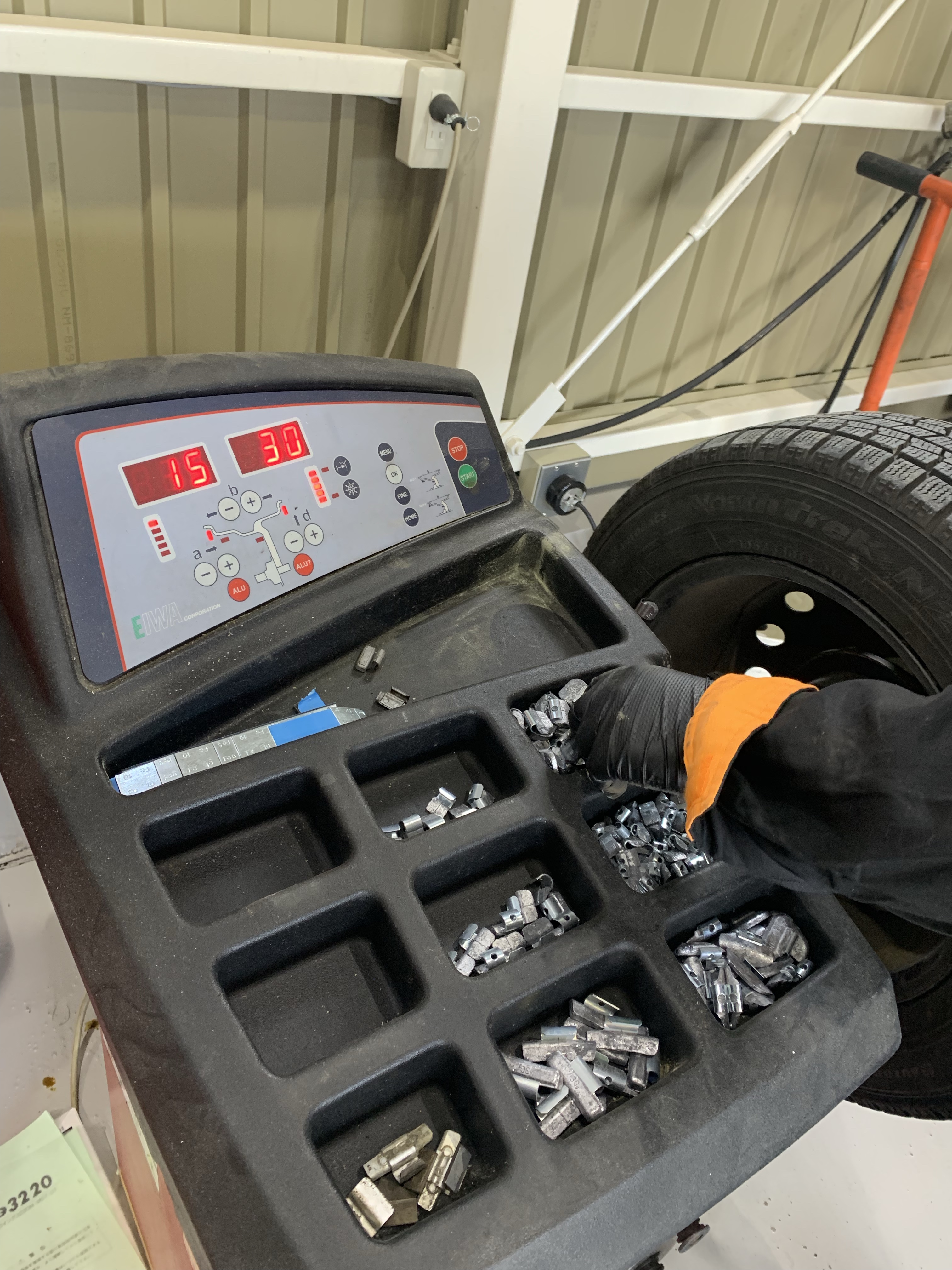タイヤがクルクル回ってバランス状態を測定してくれます。そしてバランスが取れるようにバランスウエイトを貼り付ける場所と重さを教えてくれるので、指示通りにオモリを付けます!