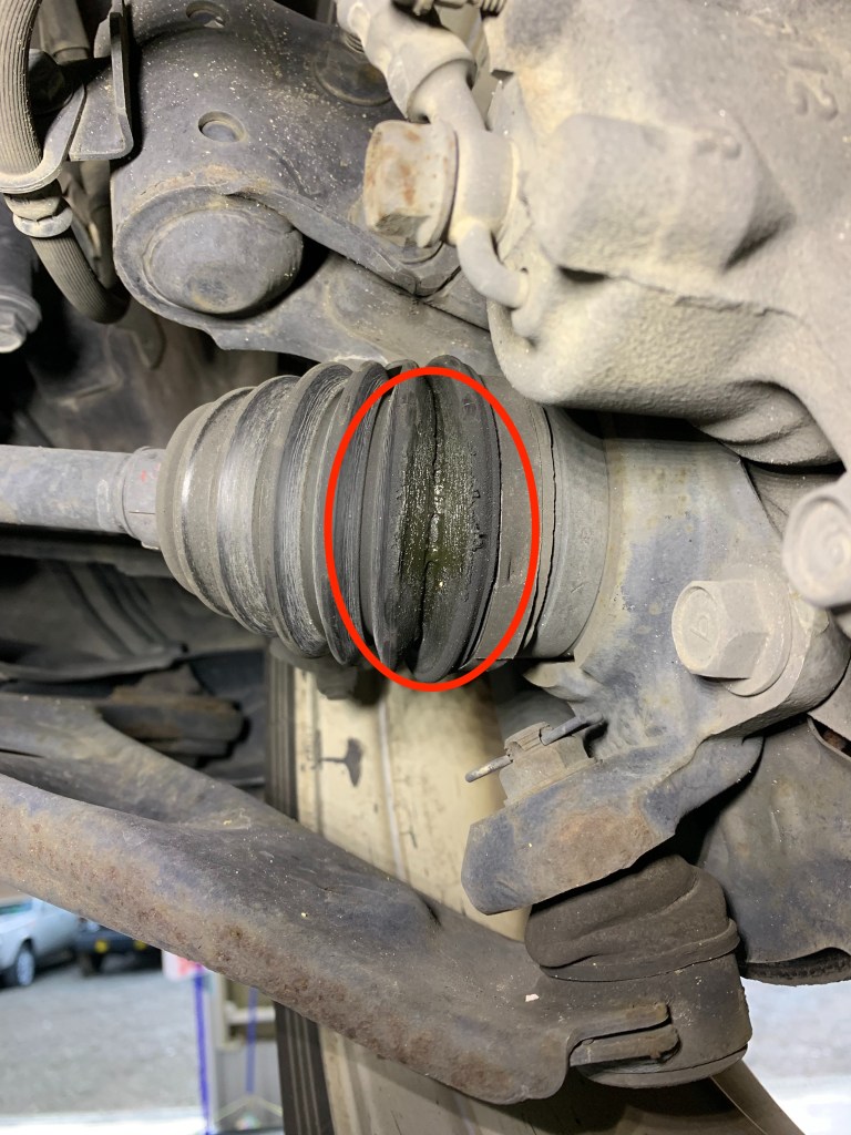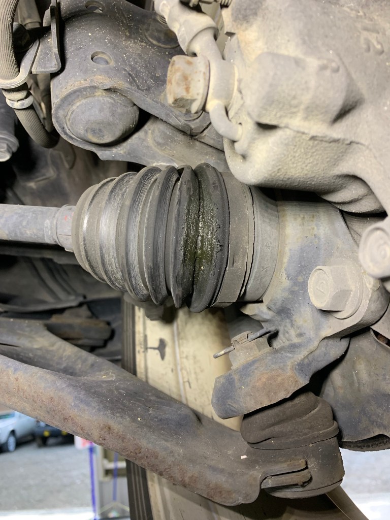 ここの部分、ドライブシャフトブーツからグリスが出て来ています。ブーツに亀裂が入ってグリスが漏れ出しているのでしょう、このままでは裂けるのも時間の問題なので、こちらもお客様と相談し、追加で作業をさせて頂くことになりました!