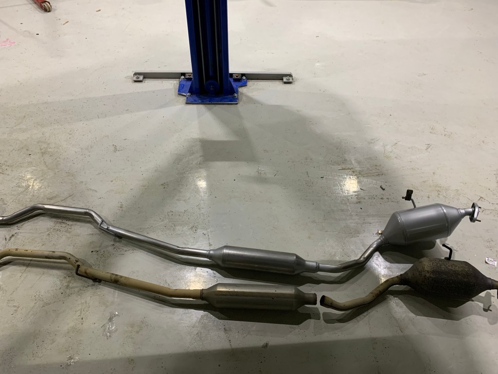 車をリフトアップしてみると、ちょっと穴が開いている程度ではありませんでした。ポッキリとマフラーが折れてしまっています^_^;