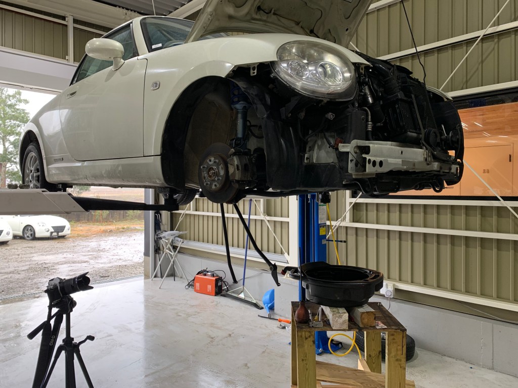 当店はリフトが一機しかないので、エンジン分解中も車を上げっぱなしというわけにはいきません。ですのでエンジンメンバーだけを車体に戻して、足廻りを仮復旧して転がして工場から出して保管しておきます(^◇^;)