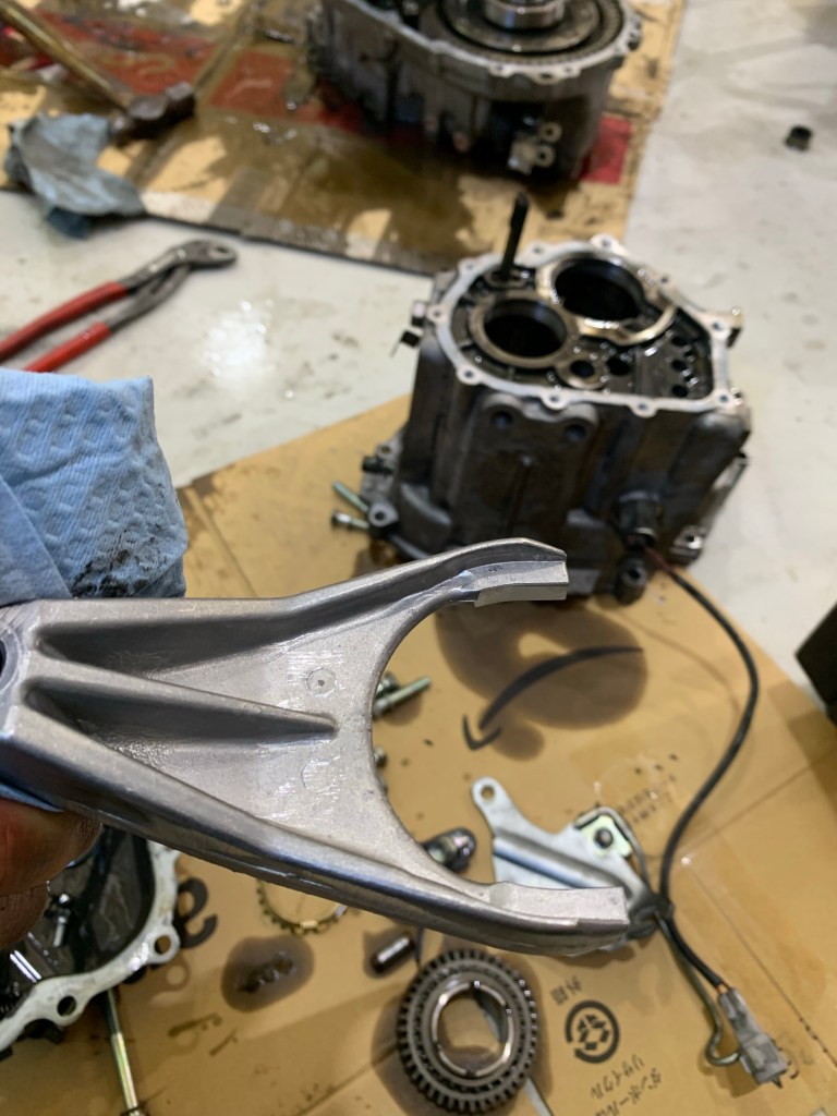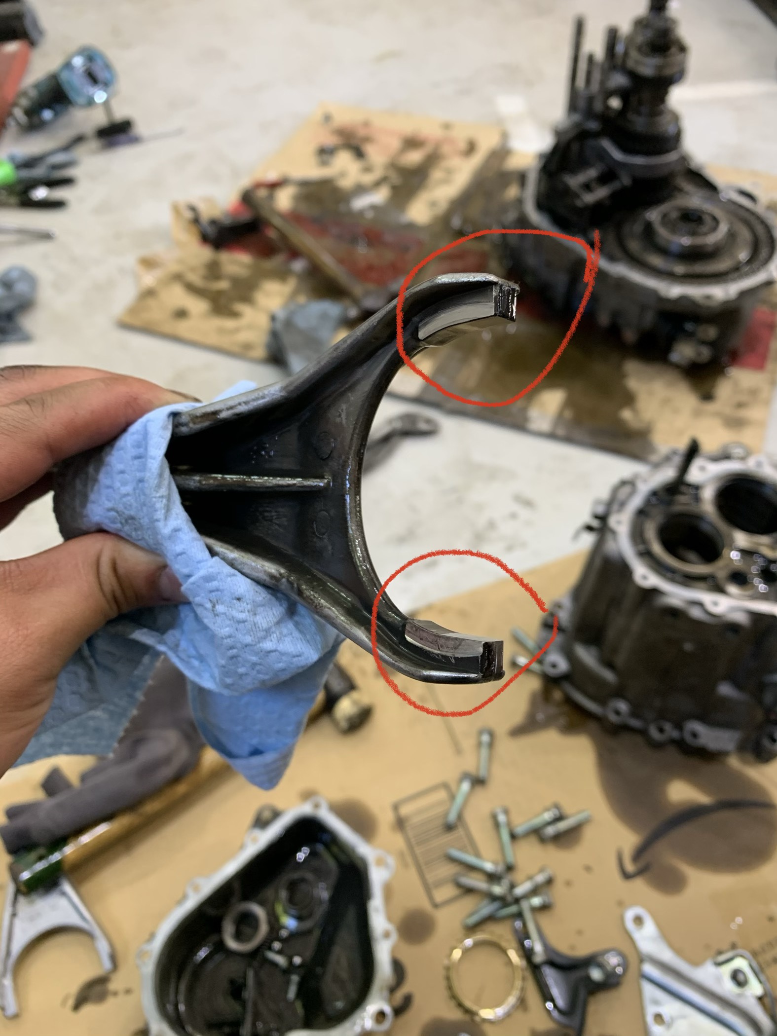 この赤丸の部分が摩耗します。特に5速のシフトフォークは摩耗しやすく、摩耗が進むとギヤが入りにくくなります。シフトノブを常に触りながら運転する方は要注意です!今回は全てのギヤのシフトフォークを交換します。