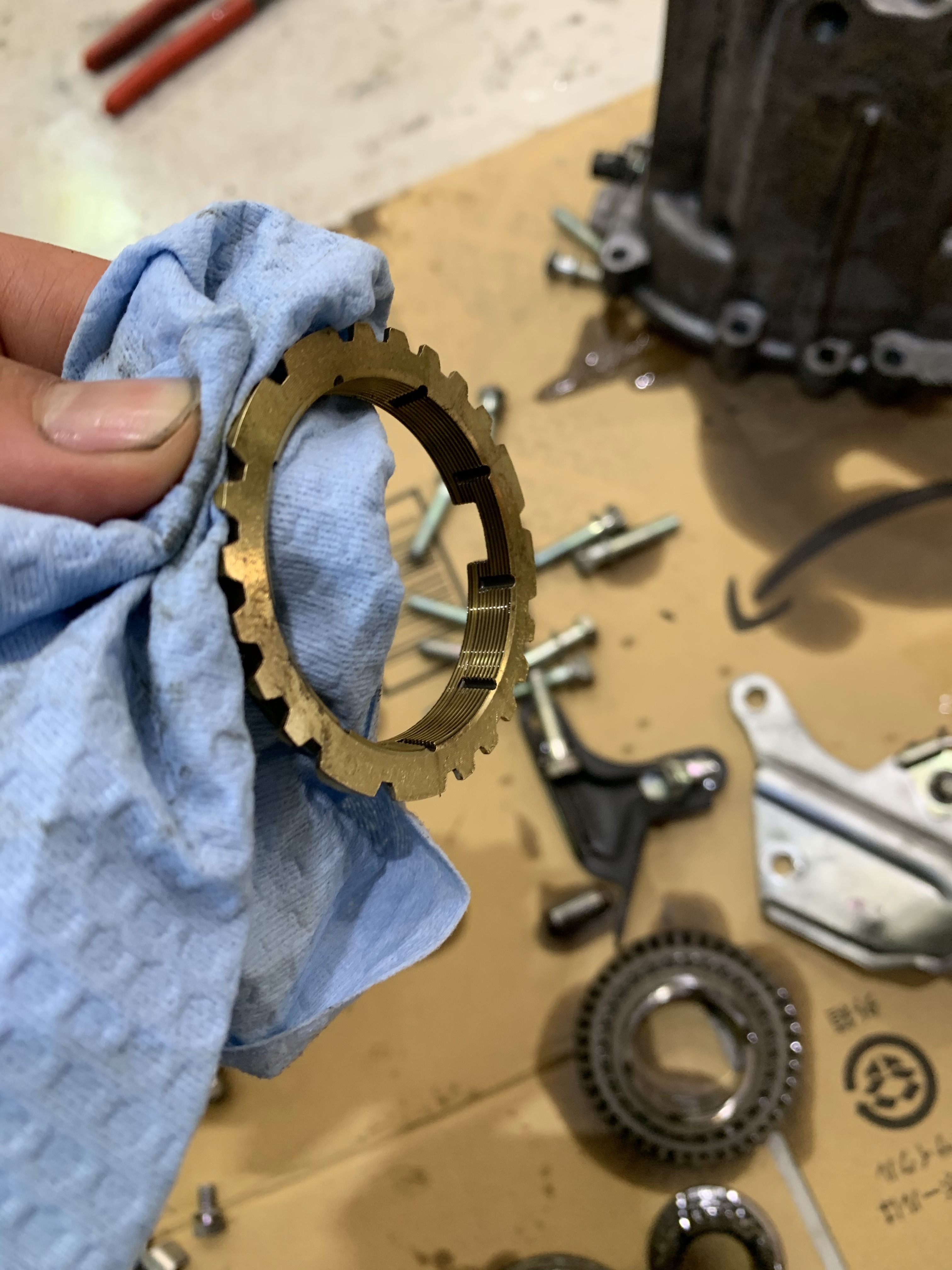 トランスミッション内部で他に摩耗する部分と言えばシンクロ機構が挙げられますが、点検したところ摩耗もほとんどなく問題なかったので、そのまま組付ます。