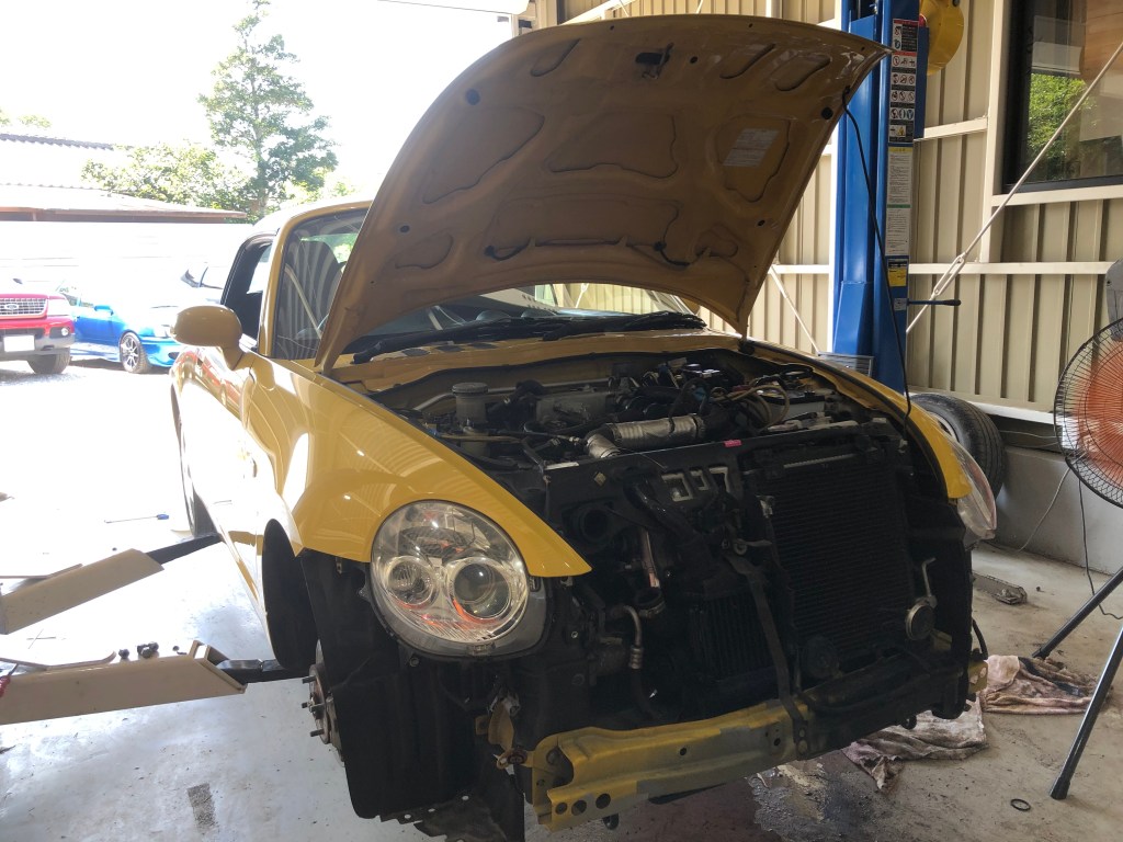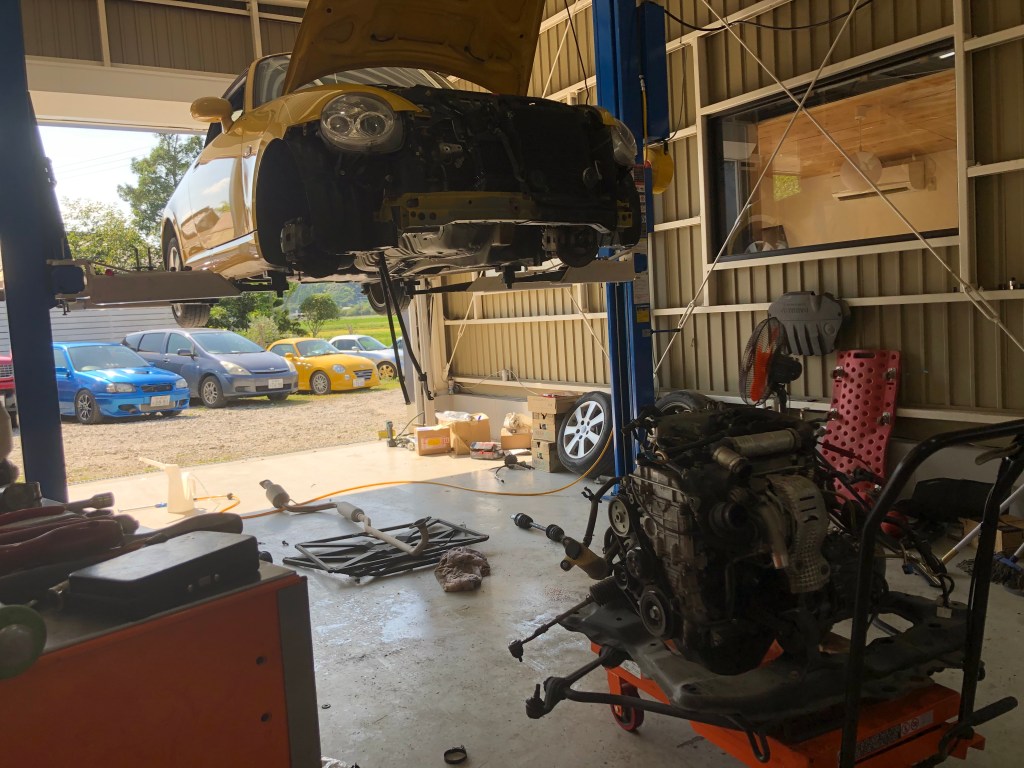 今日の朝から作業を始めて間に来店のお客様のBMW320iのオイル交換や、コペンのブレーキフルード交換などの作業を挟み、クラッチ交換後にエンジンとミッション、エンジンメンバーとを合体させて本日の業務は終了です。
