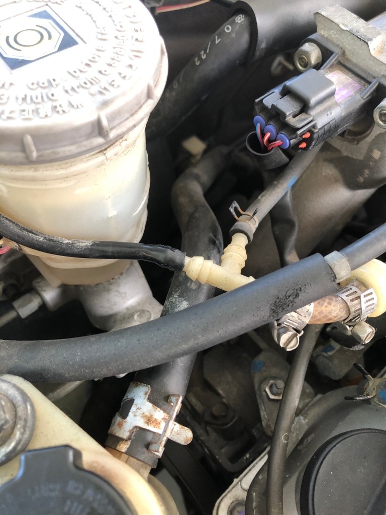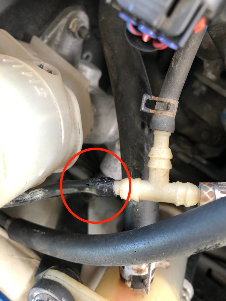 ここのホースが硬化して亀裂が入っています。エンジンをかけた状態で点検するとシューシューいっていたのですぐにわかりました。