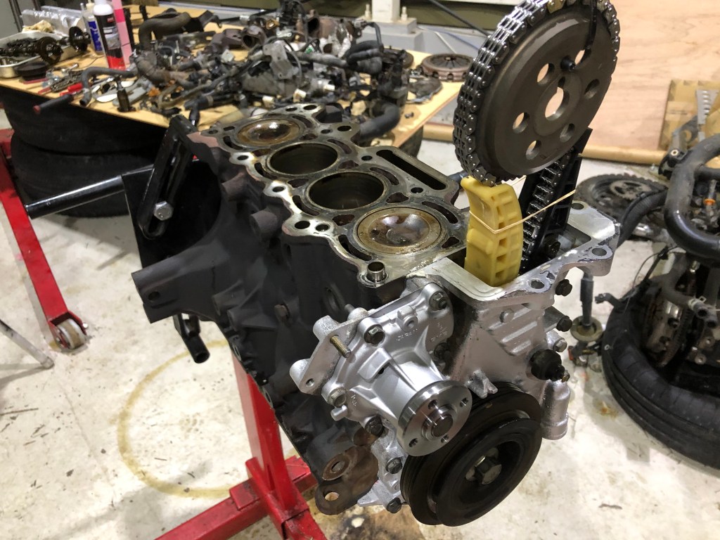 合間合間に昨日清掃したエンジンを組み立てます。新品部品や綺麗にした部品を使って組み上げていくと、生まれ変わったエンジンが誕生するので気持ちが良い作業です。