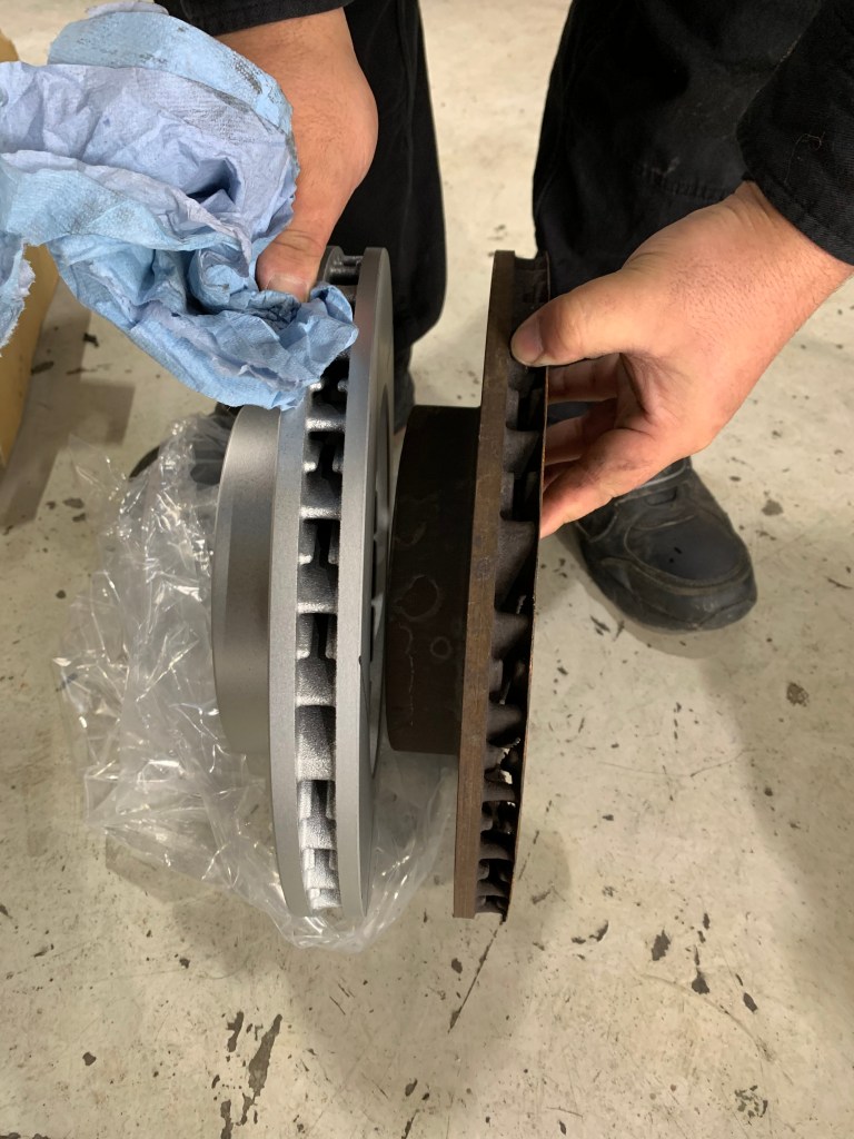 上が新品です。内側のディスクローターの表面が完全になくなっていて、内部の構造が丸見えになってしまっています。