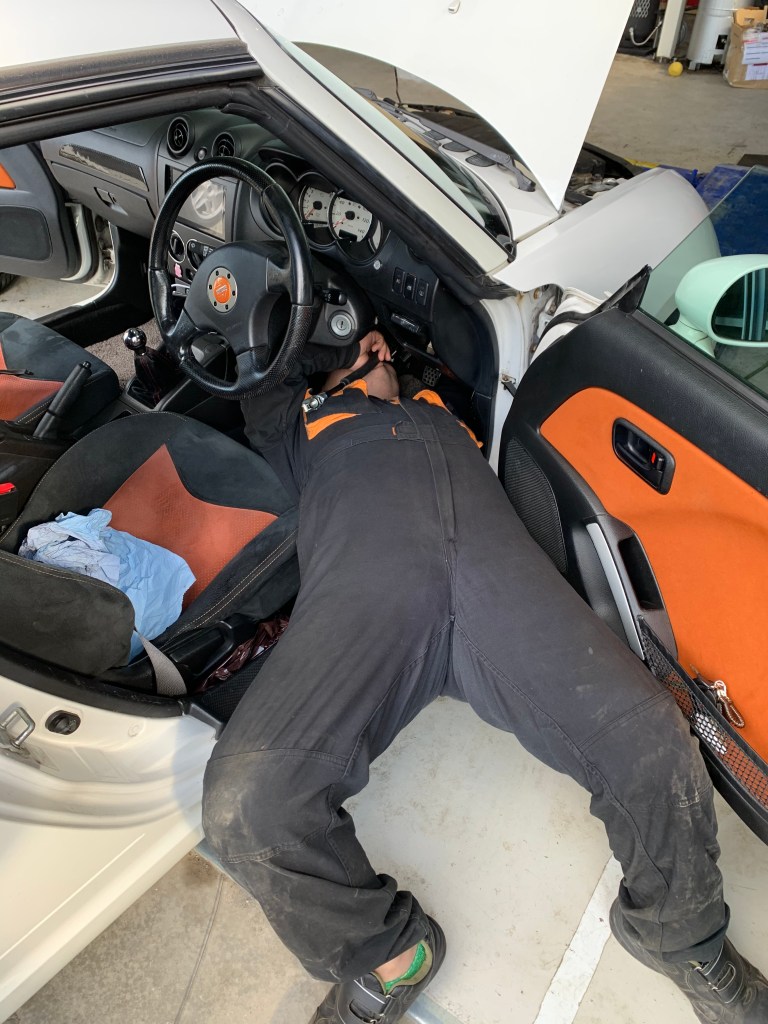 こんな感じでアクロバティックな姿勢とをりつつワイヤーを抜き取ったり、入れたりします。1人でも時間をかければ作業可能ですが当店では1人が車内、1人がエンジンルームからアシストして作業をすることで素早く交換をしております。