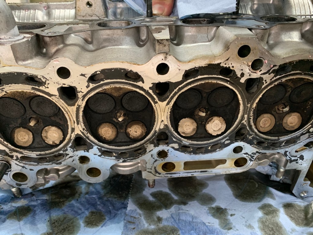 ちなみにこの黒い粒々やシリンダーヘッドのバルブに付着している汚れがエンジンオイルの燃えカスになります。この燃えカスが悪さをして異常燃焼が発生してバルブが溶けて圧縮不良になったりすることもあるので要注意です!
