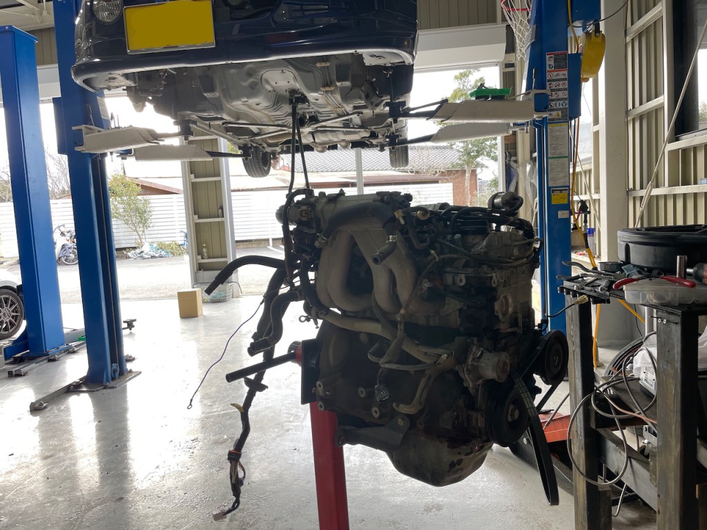 コペンは軽自動車で4気筒、横置きレイアウトエンジンですのでスペースが厳しく、エンジンとミッションを車上で分けるのが困難です。