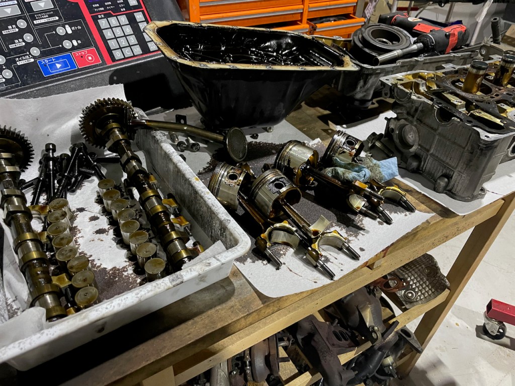 どんどん分解していきます。エンジンの内部にはたくさんの部品があって、その一つ一つが大事な役割を担っています。各部だいぶ汚れていますので、この後清掃してから消耗品関連を交換して組み上げていく予定です。