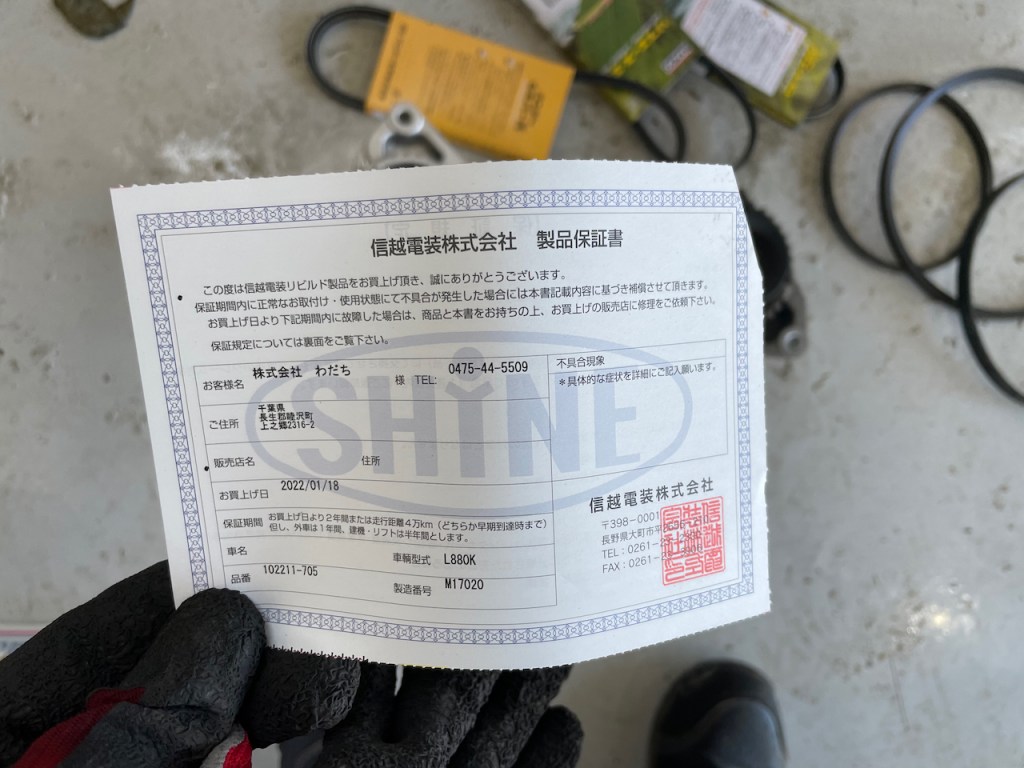 当店の使用しておりますリビルトオルタネーターには保証が付いておりますので、万が一製品不良があった場合でも保証で対応できますのでこちらもご安心いただければと思います。