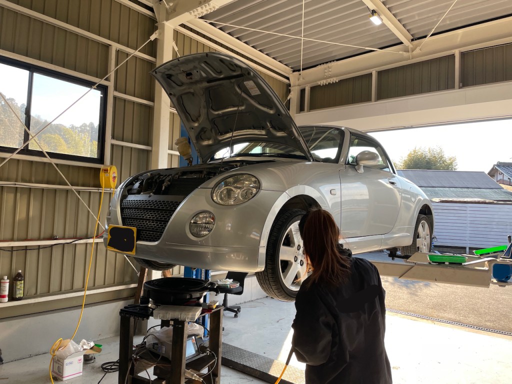 続いてはパールホワイトのコペンさん。以前に当店にクイックチェックでご来店いただき、その際に今後の整備プランをお話しさせて頂きました。