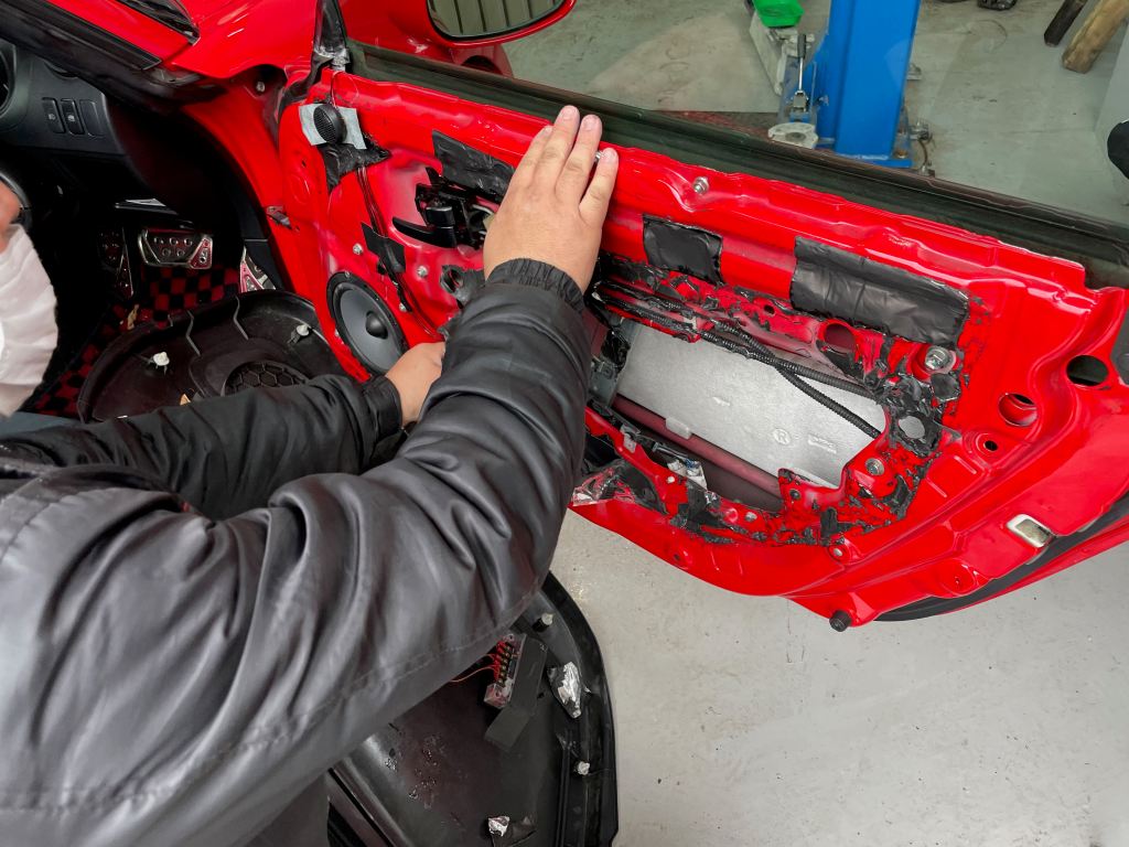 最後にドアロックの修理。音響を良くするためにデッドニング施工されていて、その影響でドアロックリンクの動きが悪くなってしまい、ドアロック本体に負担がかかり故障してしまっていました。