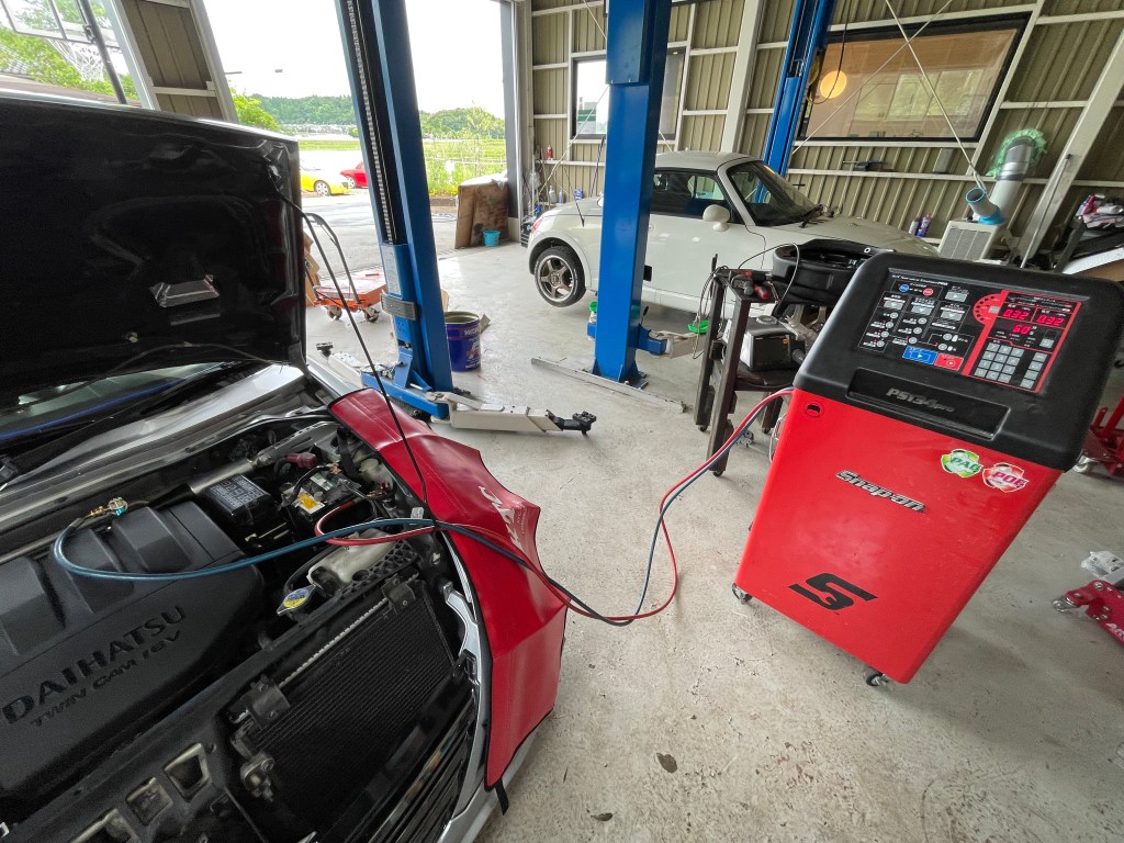 こちらの高性能マシンさん。車両中のエアコンガスを一旦回収して再生して純度を高め、クリーニングした上で再度充填します。その時にガス量が規定値よりも少なければ新品ガスを補充もしてくれる賢いマシンです。