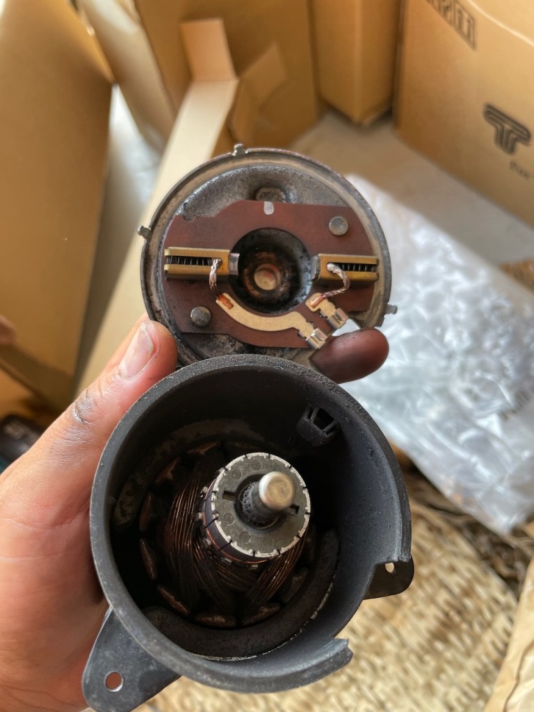 赤丸の部品がブラシです。使用と共にブラシが擦り減っていき、この配線が引っかかってブラシが伸びなくなってしまうとコイルに通電されなくなってモーターが回らなくなってしまうのです。