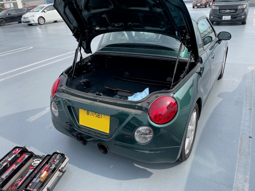 まずは香川県での作業です。こちらのグリーンのコペンさん、症状としてはアクティブトップの動作が遅いことに加えて荷物を収納するためにトランクを開けると閉めることができなくなってしまうそうです。確認してみると確かに一度イージークローザーが作動して閉まるのですが、すぐにまた開いてしまいます。