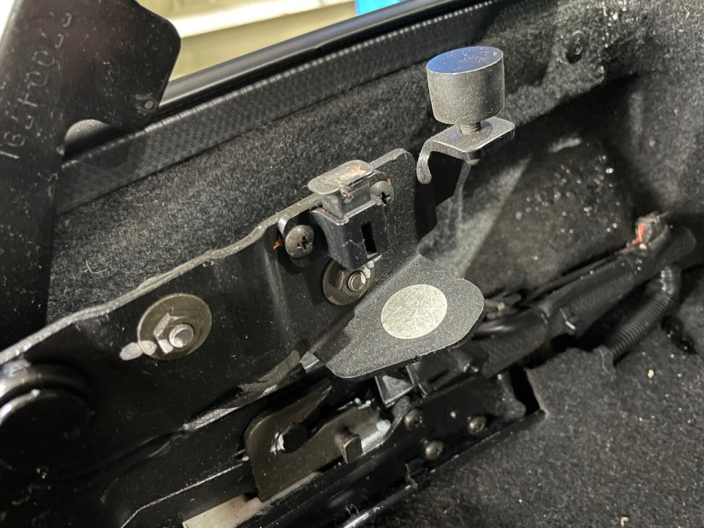 トランク側センサー部分にワイパーの骨組みの金属を細かく切ったものを貼り付け、なんとかセンサーを誤認識させてトランクを閉めることに成功しました!診断機を用いてコンピュータの認識状況をモニタリングしながら位置を微調整して、3本貼り付けると認識してくれることが判明。