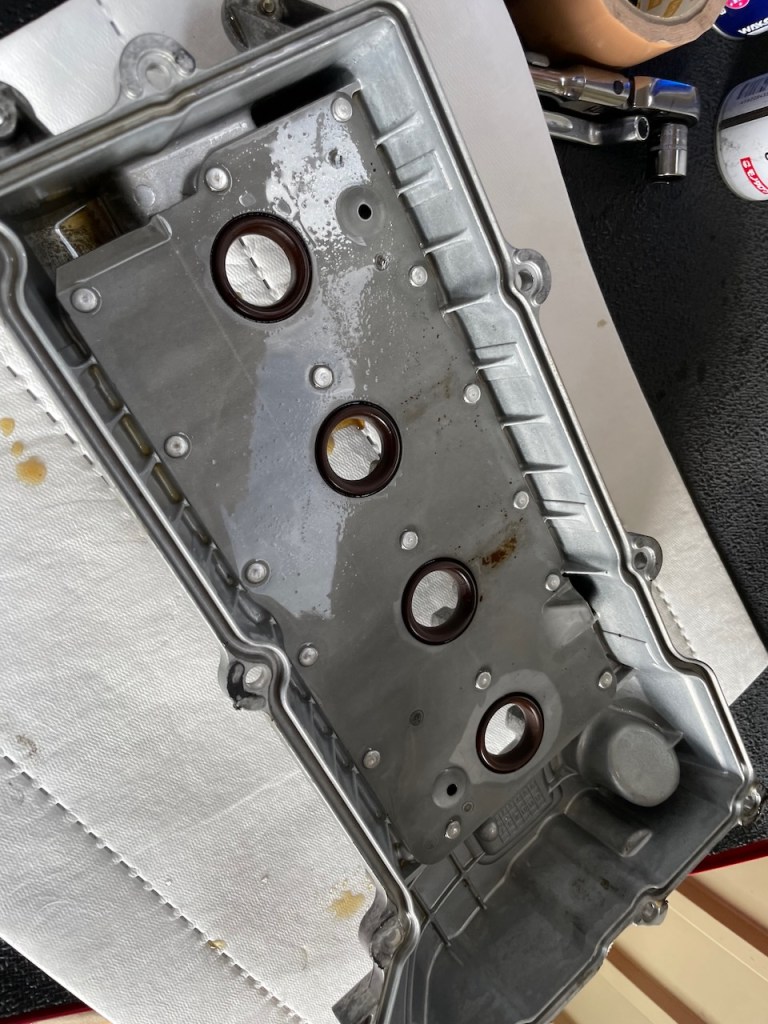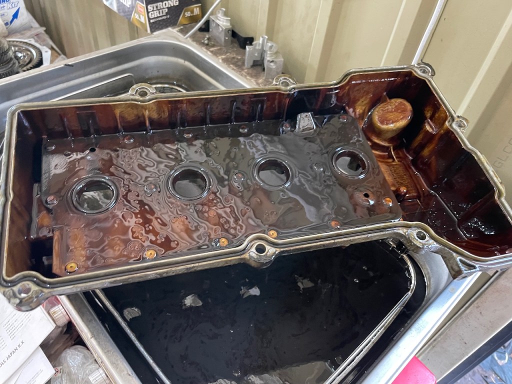 こちらが取り外したヘッドカバー。ヘッドカバーを外すとエンジン内部の様子を垣間見ることができて、オイル管理の状況がよく分かります。こちらのコペンさんは”並”といった様子で、タイミングチェーン等にダメージは入っていませんでいたが、汚れはそれなりに蓄積されている状況でした。