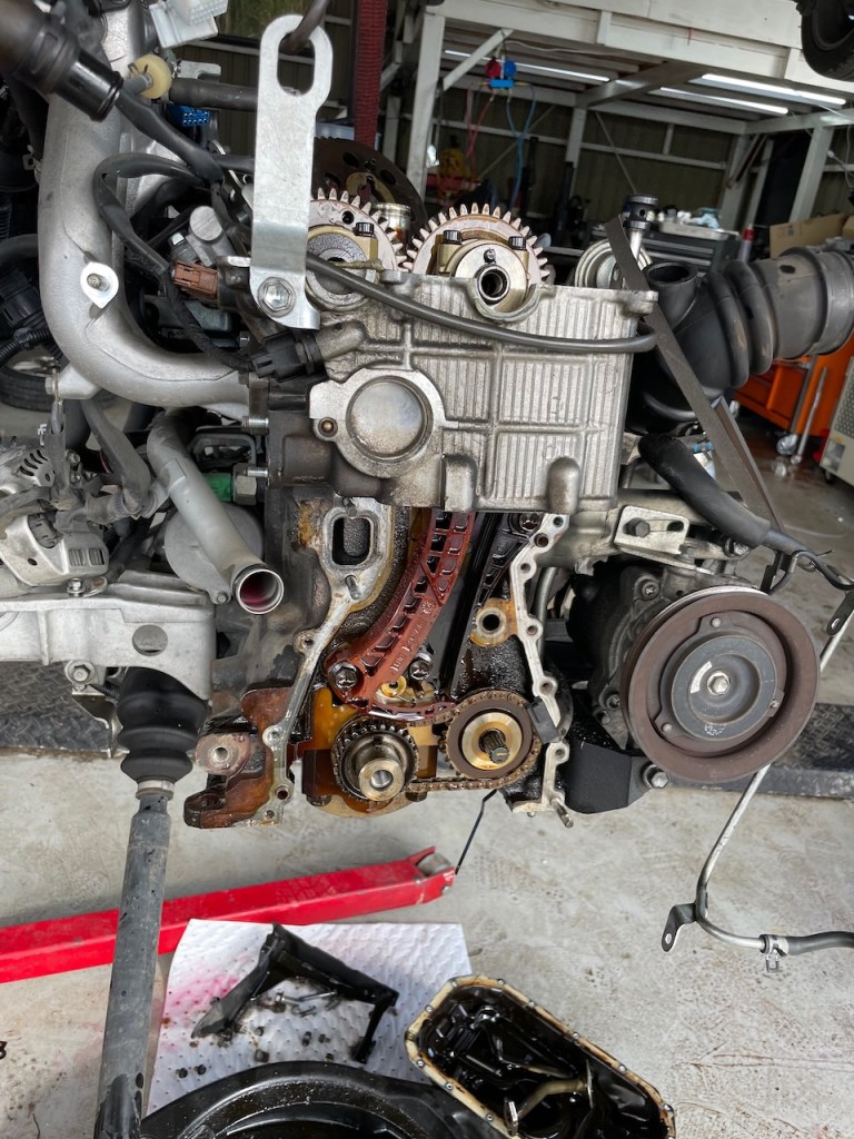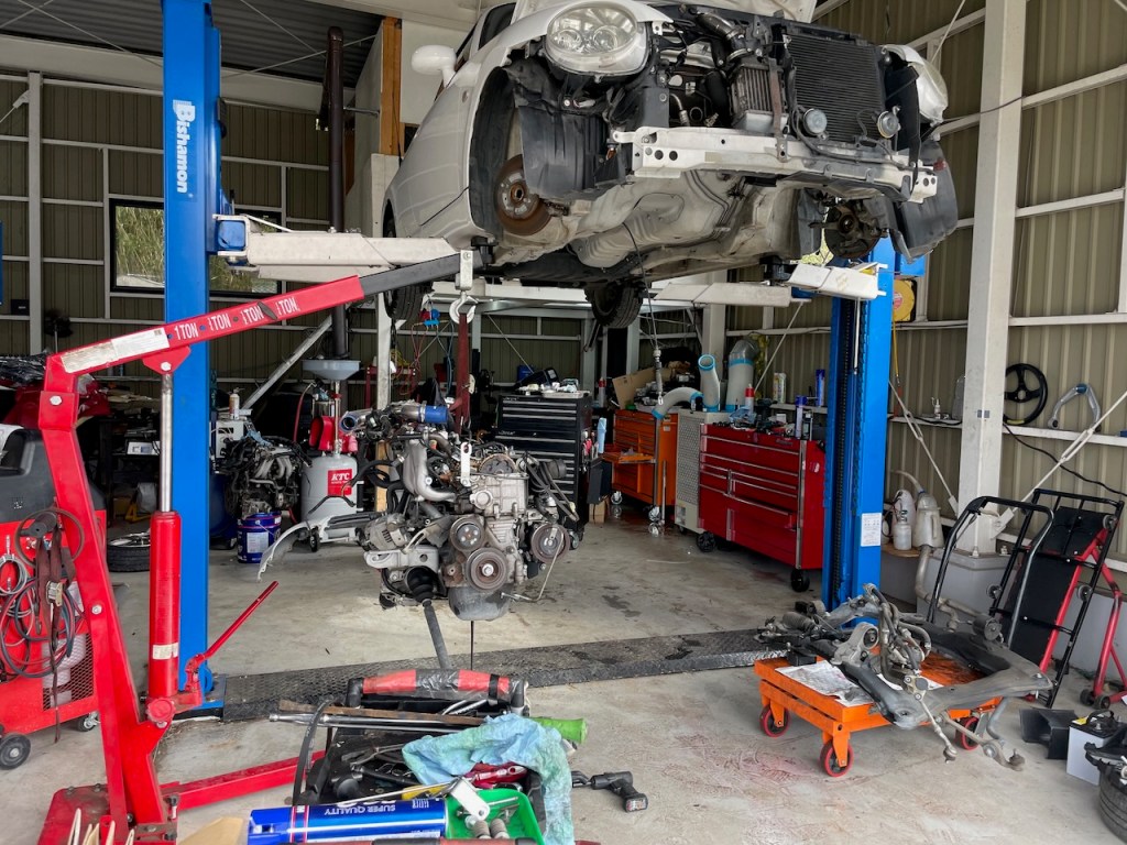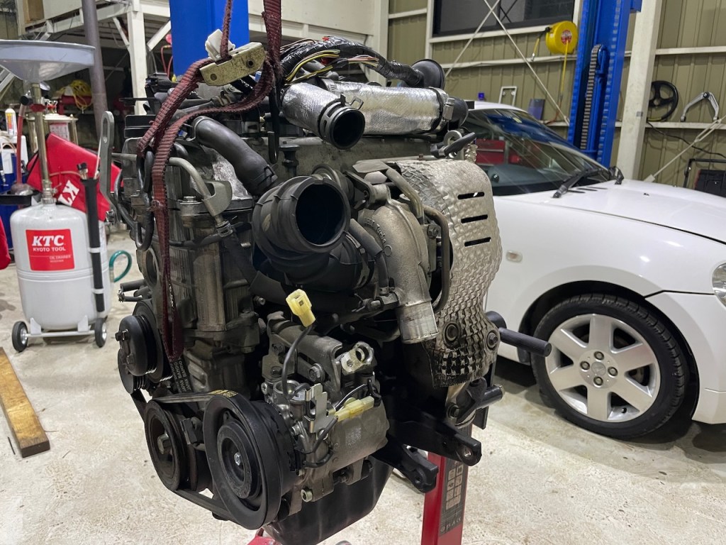 こちらはエンジン降ろしの様子です。昨日の夜に1台降ろしました。修理の内容はエンジン異音の修理で、前段階の点検でタイミングチェーンの伸びが確認できていたので、タイミングチェーンを交換します。