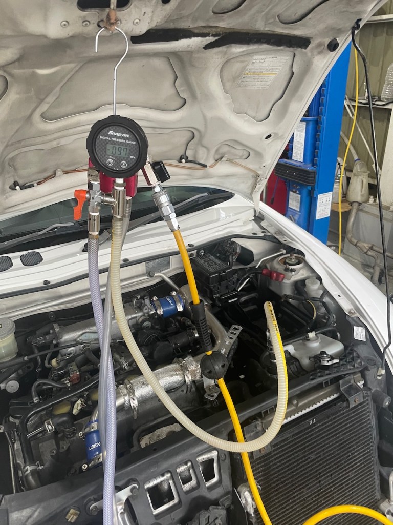場面は飛んでエンジンを組み上げた後に車体に載せて最後のチェック中です。これはエンジンの冷却水を充填するための道具で、エンジン内部を負圧にして一気に充填します。負圧の値を見ることで漏れチェックもできますし、ヘッドの歪みなども簡易的に点検することも可能です。