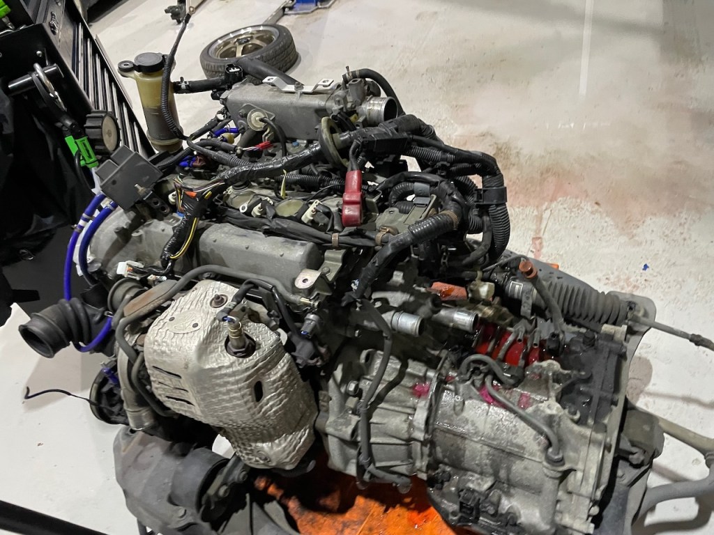 ちらっとみえるエンジンマウントも同時交換お勧めな部品の一つ。今写っているマウントは車上でも作業しやすいのですが、裏側の一番ごっついマウントはエンジンを半脱着しないと交換できない位置にあるので、降ろしたついでに作業必須です。