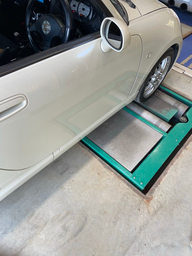入れ替えごはサイドステップテスターで保安基準範囲内かチェック。このあたりも新工場で導入した新機材でして重宝しております。