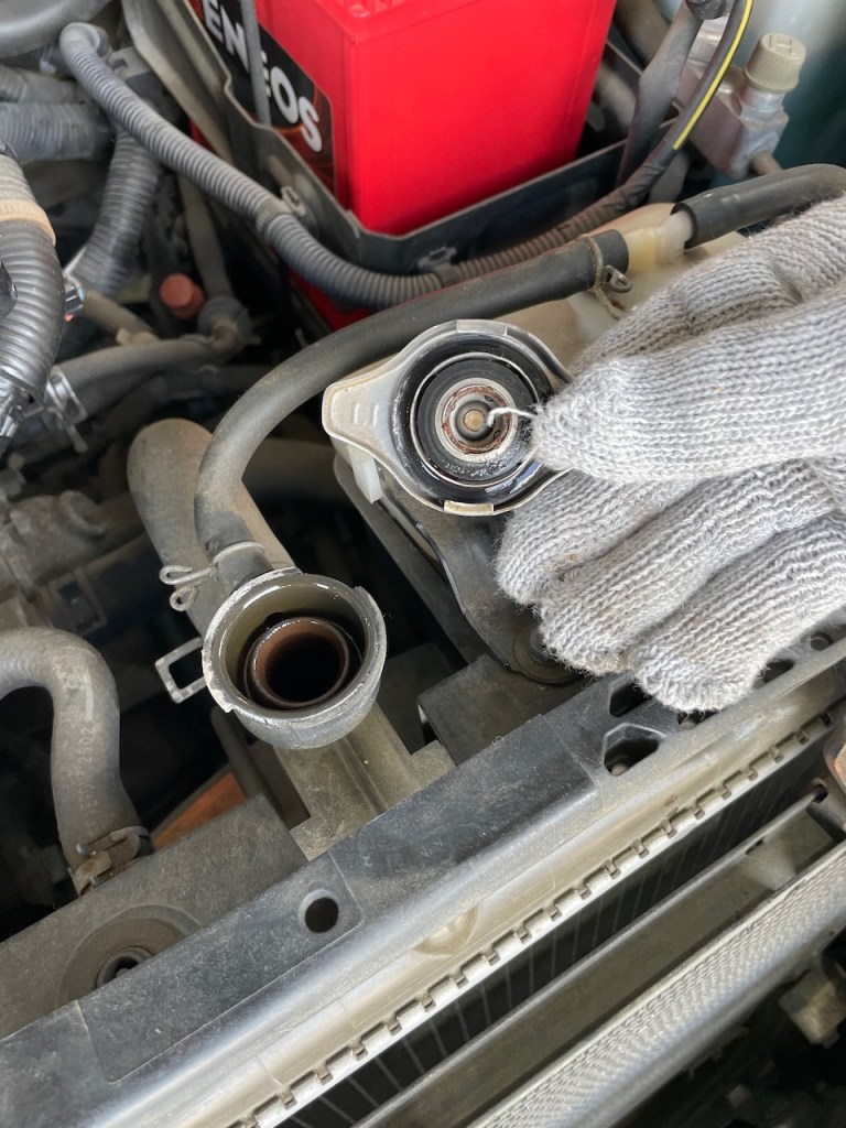 ラジエーターキャップも要点検ポイント。このように破損してしまっている場合はエンジン本体にオーバーヒート歴がある可能性が高いので要チェックです。