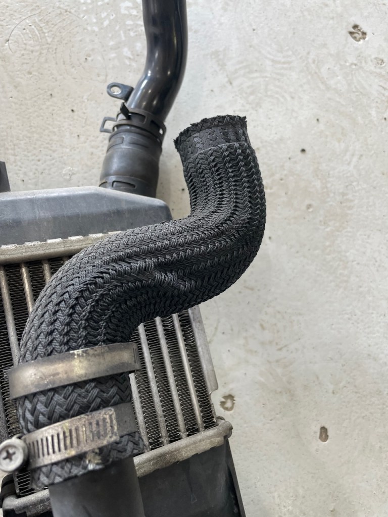 こちらはイレギュラー整備でインタークーラー裏のホースに亀裂があって、ここからブースト圧が漏れているようです。このホースの周辺がオイルで汚れている場合は亀裂を疑いましょう。交換して仕上げます。