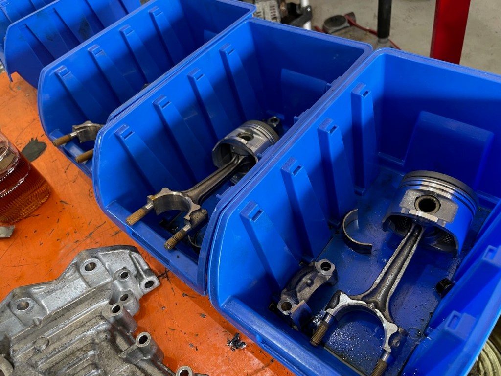 こちらも日課でもあるエンジンオーバーホール作業。ピストンをシリンダーごとに整理して組み立てている様子です。