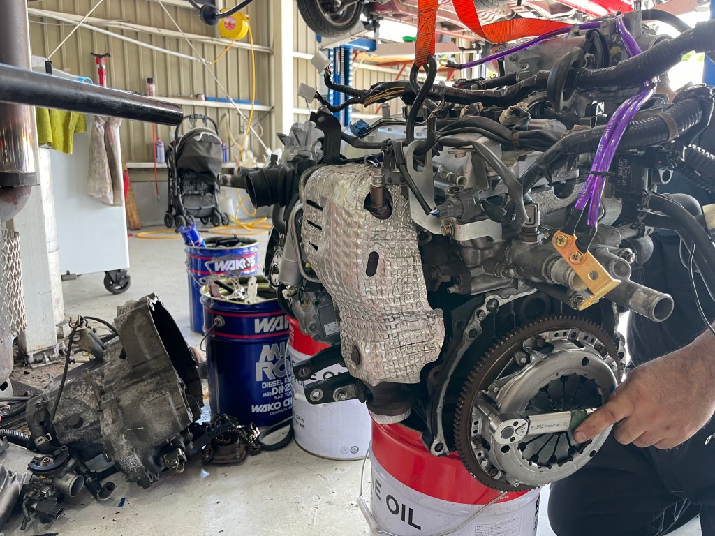 オーバーホール済みのピカピカのエンジンが乗っかりました。これでMT化と相まって元気に走ってくれることでしょう!