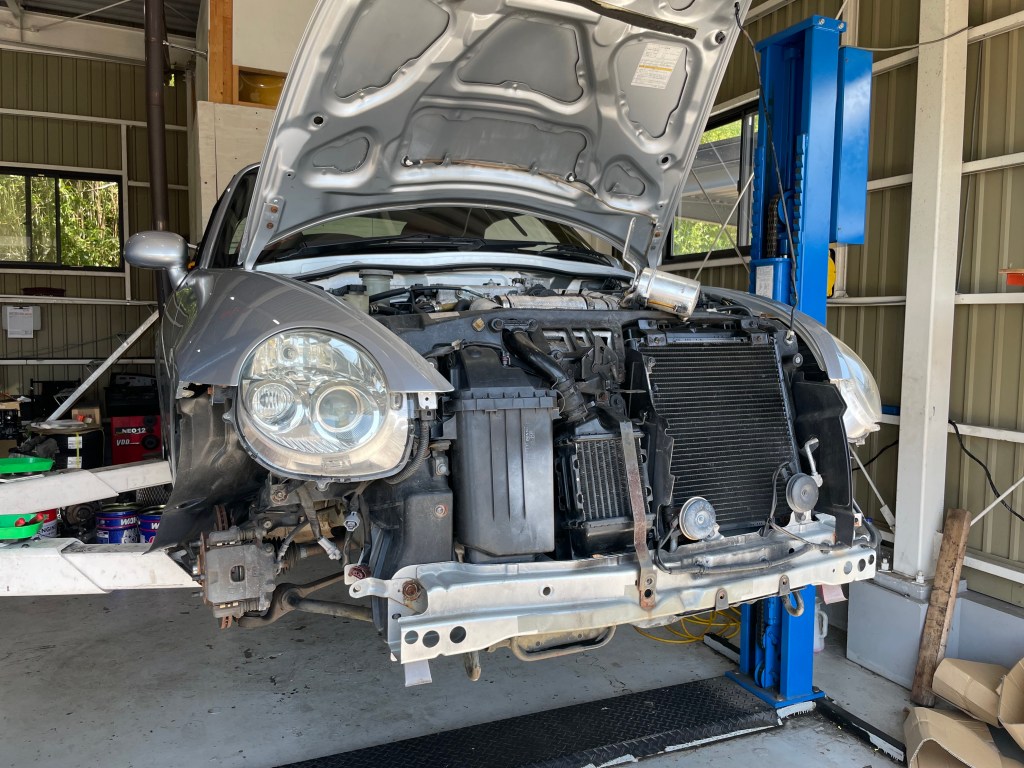 前周りを分解してラジエーターやオイル漏れの見られたエアコンのコンプレッサーを交換します。