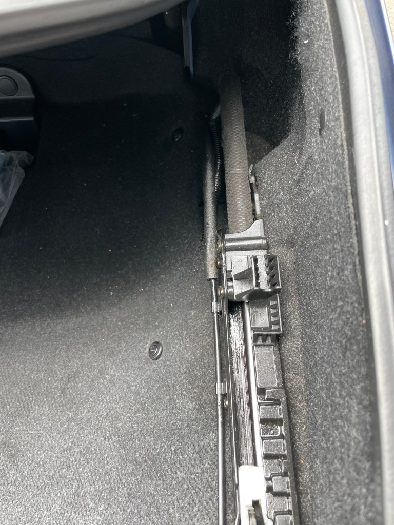 トランク開閉用のシリンダから作動油が漏れています。ちょうどホースとシリンダの付け根から漏れてしまっているので、動作をさせると1回で作動油が抜け切ってしまいました。