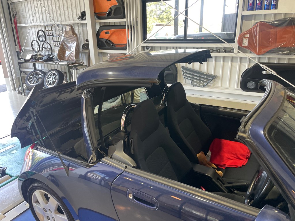 さてたまたまカラフルな3台が並んだので急いで撮影。まずは青いコペンの電動オープンの方を修理していきます。