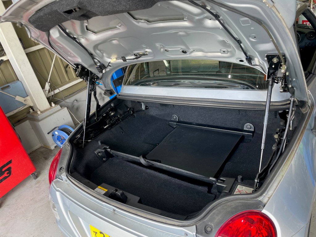 続いては当店とくいのアクティブトップの修理。屋根が開かない+トランクも開かない状況のコペンがご入庫です。まずはピッキング技術を駆使してトランクを開錠。