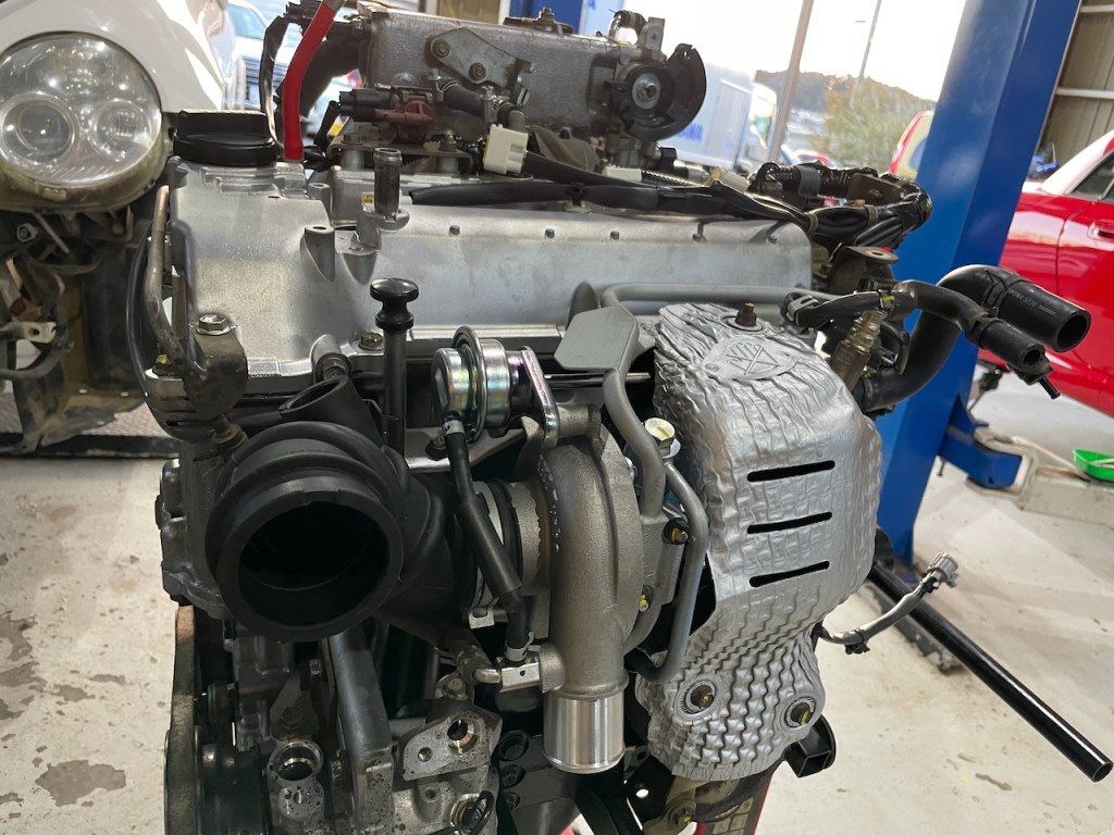 タービンもリビルトではなく新品をチョイス。タービン周りの配管もリフレッシュしましたので、見た目はほとんど新車同然。もちろん中身もピカピカですのでとても38万キロのエンジンには見えないと思います。