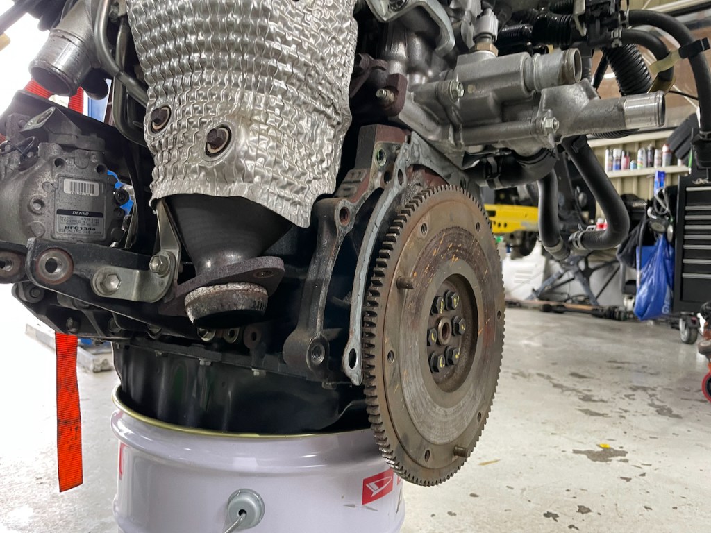 エンジンにフライホイールを取り付け。こちらは中古品をチョイス。ご予算に合わせて中古品、リビルト品、当店オーバーホール品、新品等組み合わせることで柔軟に作業内容を費用を変更可能です。