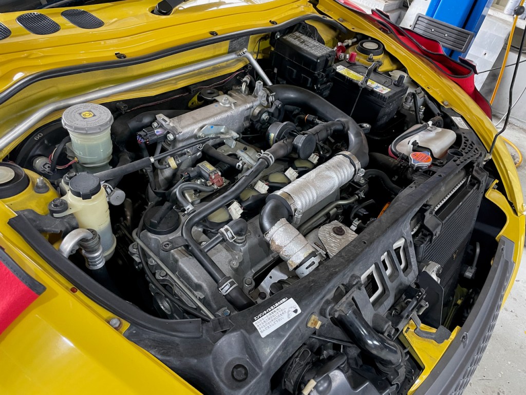 MT化作業のコペンが試運転に移りましたので、空いたリフトに次のエンジン作業のコペンがピットイン。ひとまずサクッとエンジンを降ろします。