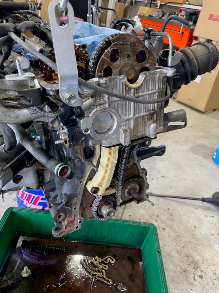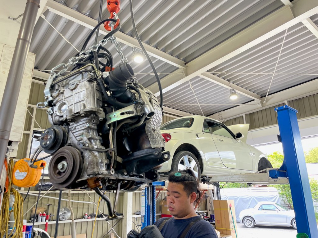 絵面的には似ておりますがこちらは別車両の商品化の様子です。走行距離7万キロほどのコペンの中では比較的距離数の少ない個体でしたが、エンジン内部点検の結果タイミングチェーンに伸びが見られましたので、今回はチェーンのみを交換いたします。
