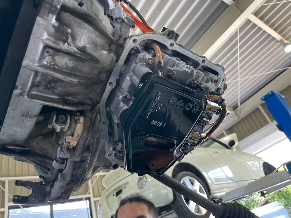 AT車でしたのでAT本体の整備も実施。オイルパンを取り外してATFフィルターを交換します。
