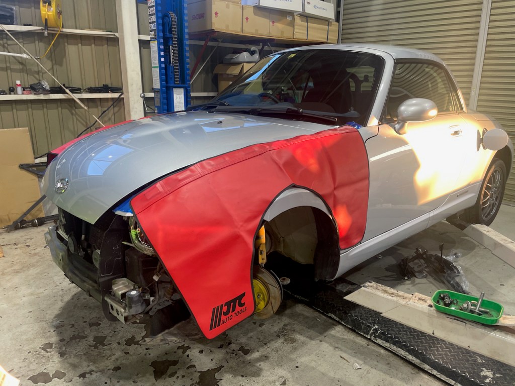 隣のリフトでは先日少しだけご紹介した冷却水が減って水温が上がってしまうコペンの修理をしております。
