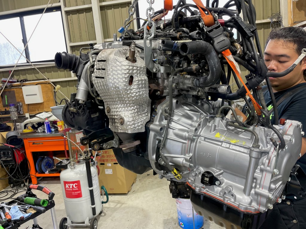 組み上げたエンジンに補器類を装着し、トンランスミッションとドッキング、その後車両に搭載します。