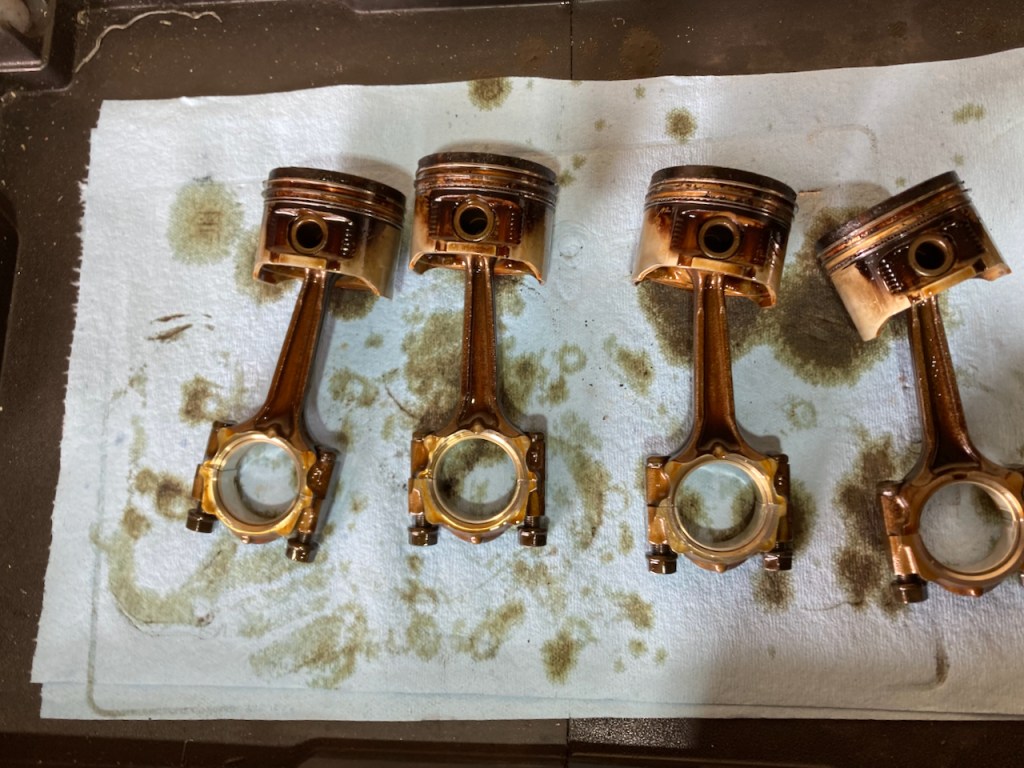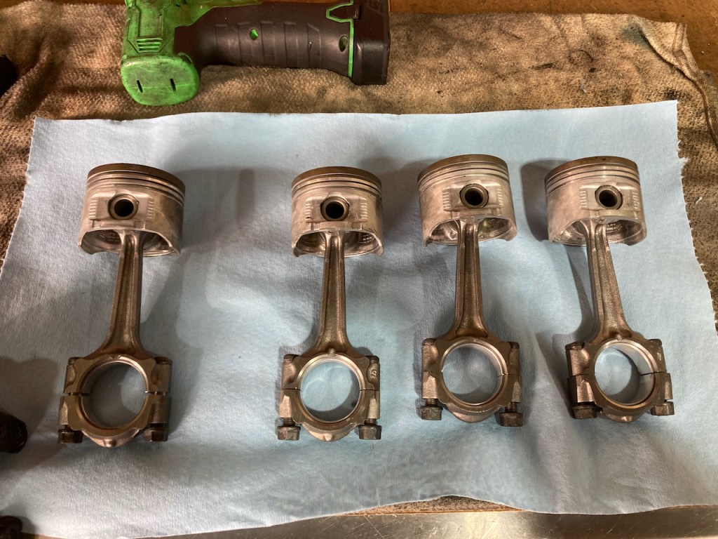 エンジンを分解して点検してみると、走行距離18万キロ近いこともあり内部はだいぶ汚れておりました。バルブの傘やピストンヘッドにもエンジンオイルの燃えかすがこびりついていた状態でしたので、トータルでオーバーホールしておいて正解だったようです。