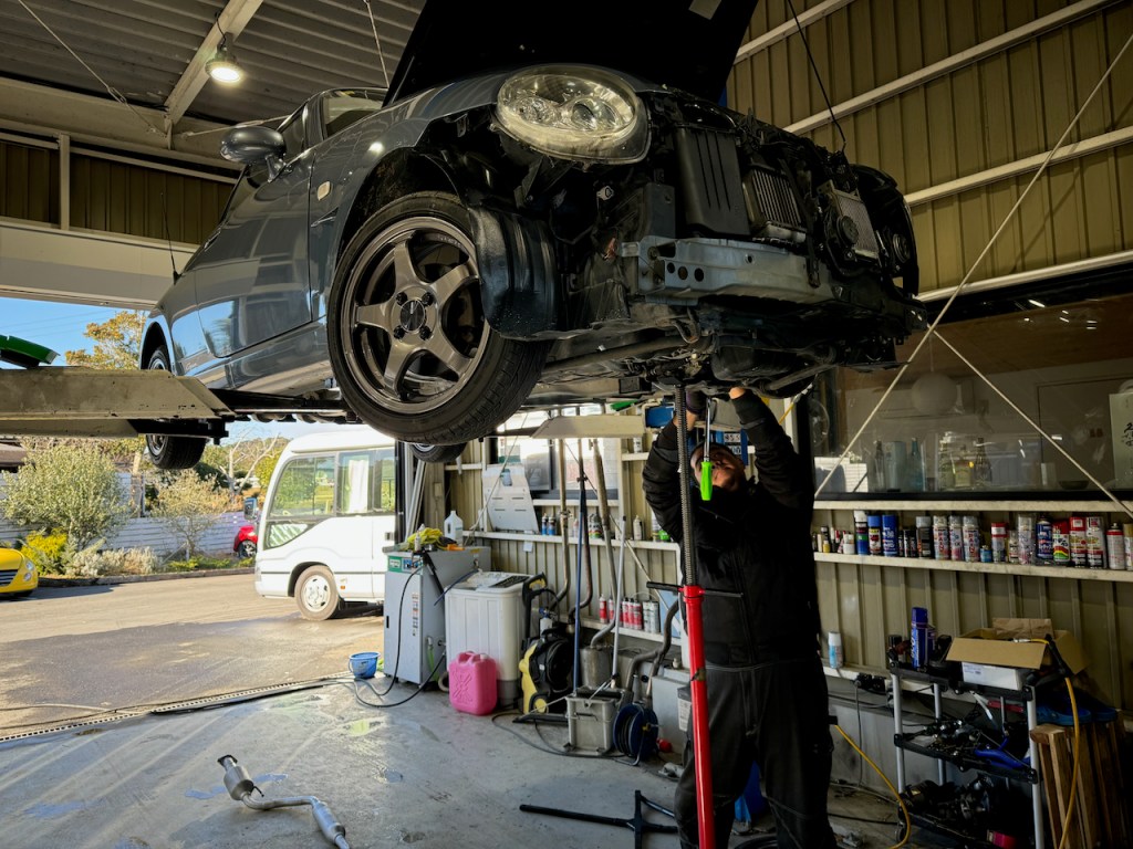 バンパーを取り外して下からエンジンを支えつつ、作業を進めていきます。