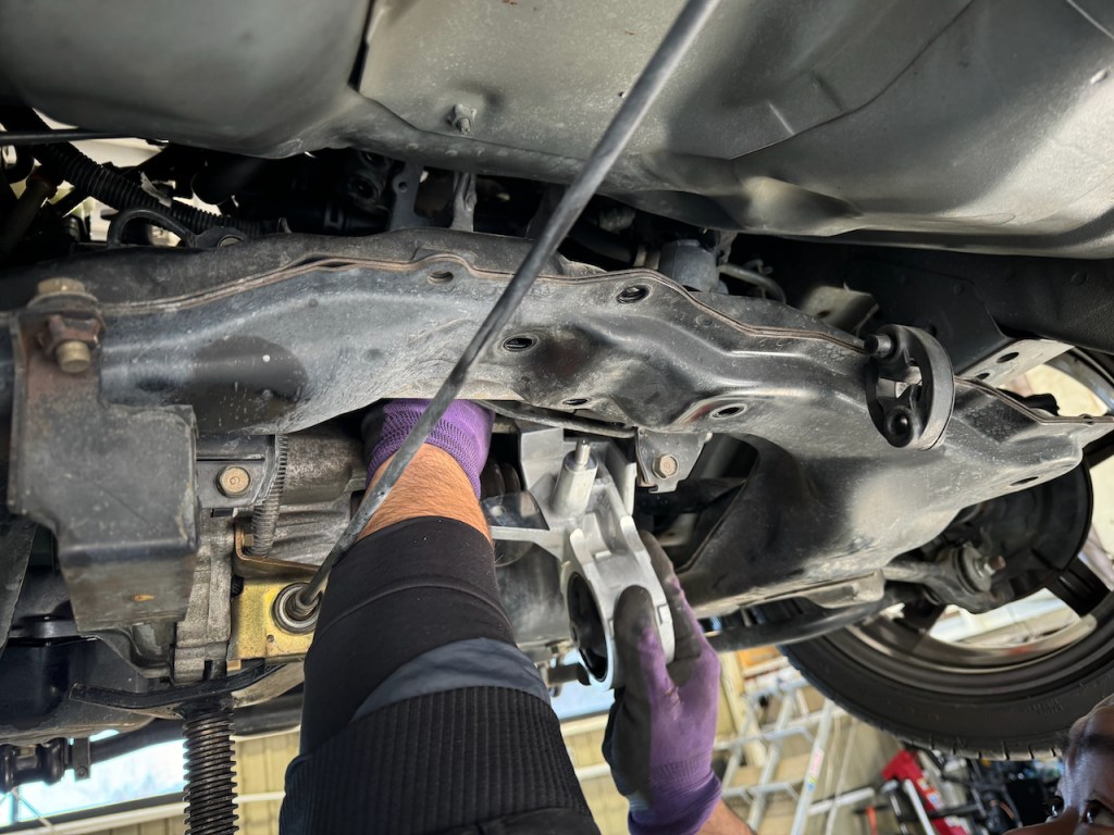 元々作業スペースが限られている上にこのマウントのボルトがかなり長い為、エンジンメンバーを下げてエンジンを半分降ろすような形でマウントを交換します。
