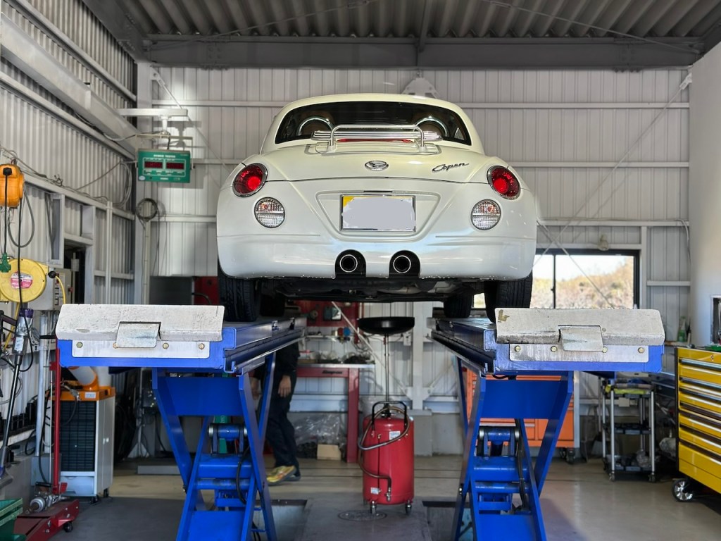 こちらは車検整備でご来店のコペンさん。一通り点検して必要な整備を施します。