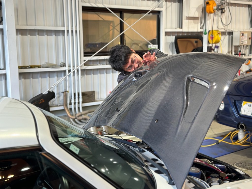 最後に新発売されたDスポーツのカーボンボンネットの取付。